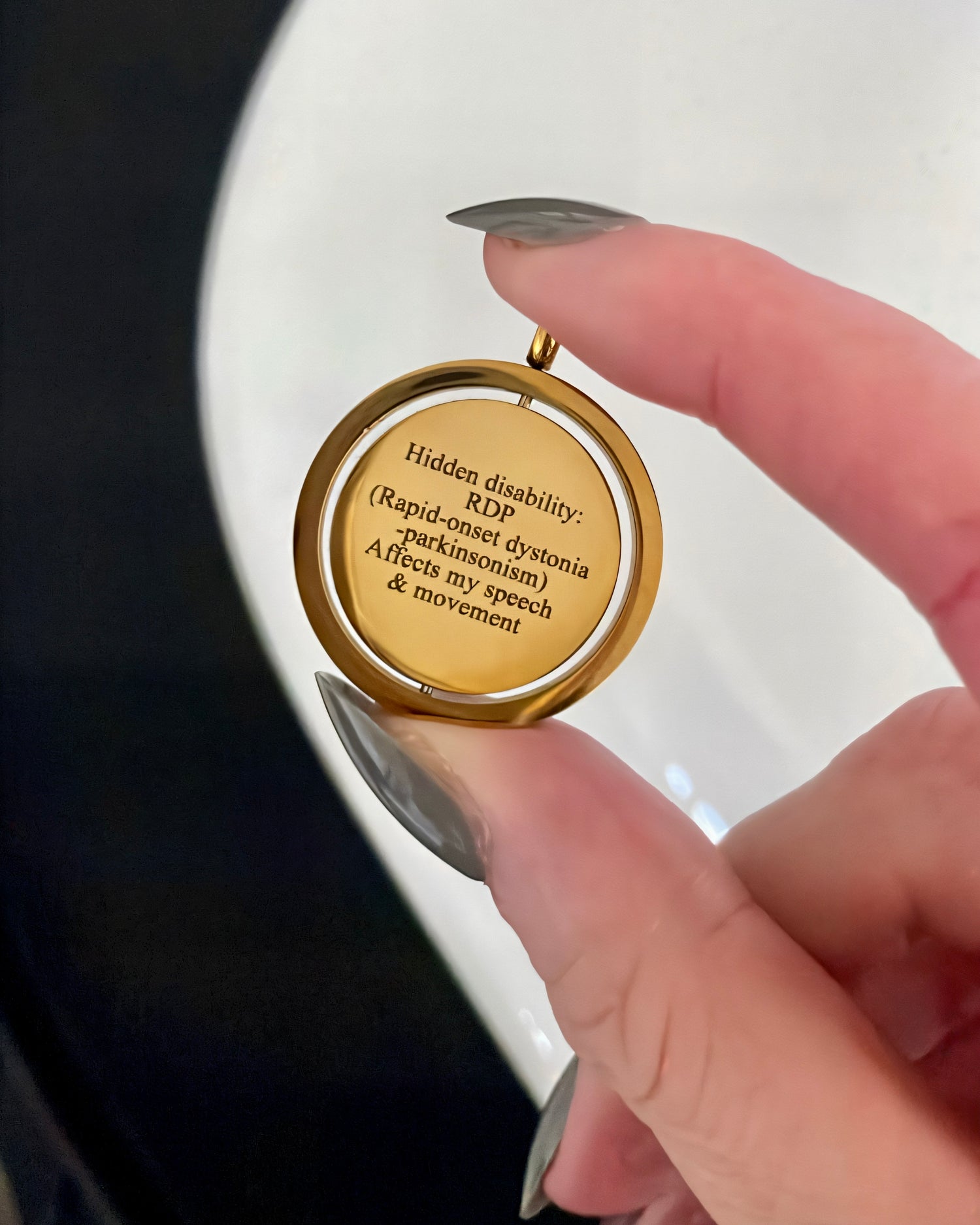 This pendant allows me to share my message on my own terms. Discreet, personal, and empowering, it can be flipped when I choose to reveal it.
